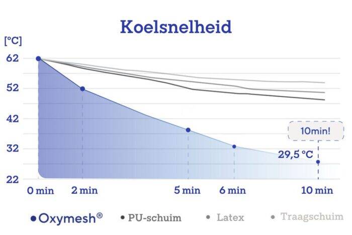 Oxymesh® droogt in slechts 7,5 uur na het wassen, en als je het naast een verwarming legt, dan duurt het drogen slechts 3 uur! Vergeleken met andere beddenvullingen is dit echt snel: